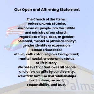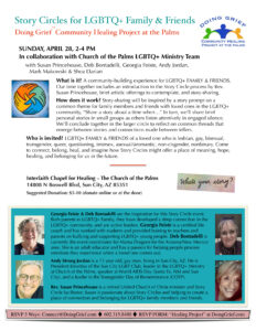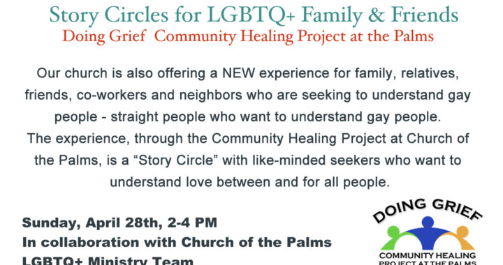 Our church is also offering a NEW experience for family, relatives, friends, co-workers and neighbors who are seeking to understand gay people – straight people who want to understand gay people. The experience, through the Community Healing Project at Church of the Palms, is a “Story Circle” with like-minded seekers who want to understand love between and for all people