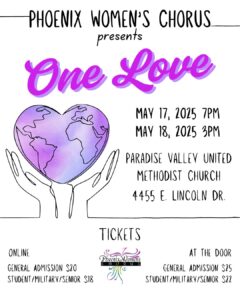 Phoenix Women’s Chorus is proud to present our 2025 May Concert! In “One Love”, we will be exploring the many different facets of that powerful emotion. We will celebrate self-love and acceptance, proclaim the joy found in the romantic, and honor and respect those suffering in global conflicts around the world. We are one people, in one world, with one love. Come raise your heart with us!