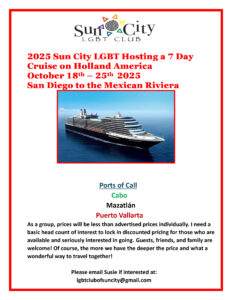 In 2025, Sun City LGBT Club is hosting a 7 day cruise on Holland America on October 18th – October 25th 2025 from San Diego to the Mexican Riviera. Ports of Call: Cabo, Mazatlán, and Puerto Vallarta.