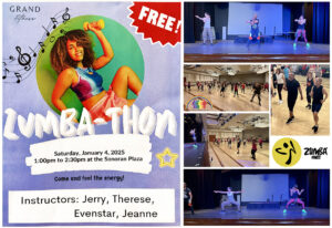 This is The Grand’s 7th annual complimentary Zumba fitness for the Grand residents at the Sonoran Plaza performed by our 3 fitness instructors: Jerry, Therese (injured but was present), Evenstar and Jeanne. As you can see in these photos, the ballroom was full and these Zumba dancers frequently attend the Zumba classes. This year, there were a few more men who participated than previous years along with LGBTQ members Frank and Jim.